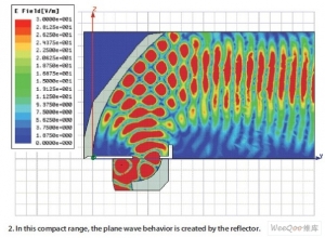 近場和反射測量也可以在室內測試場進行,而且通常是近場或緊縮測試場。在緊縮測試場中,反射面會產生一個平面波,用于模擬遠場行為。這使得可以在長度比遠場距離短的測試場中對天線進行測量。在近場測試場中,AUT被放置在近場,接近天線的表面上的場被測量。隨后測量數據經過數學轉換,即可獲得遠場行為(圖2)。圖3顯示了在緊縮測試場中由靜區上的反射面產生的平面波。