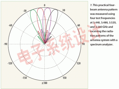 在3.4到3.6GHz頻段的開放環境對多束天線系統的輻射模式進行了測量。采用相位匹配RF電纜連接波束成型器與天線。波束成型器的輸入端口接3.440、3.480、3.520和 3.580GHz這四個不同的中心頻率、每個頻道的帶寬是7MHz。測試所用的RF功率是+5dBm,來自天線和波束成型器的聯合接收功率的測量是利用頻譜分析儀在距離200m處進行的。接收到信號的功率在以200m為半徑的圓周每隔1.0deg.測量一次,其中把四束天線作為圓周中心。圖7顯示了該實際輻射樣式。圖6也給出了采用MATLAB 軟件模擬得到的理論輻射樣式。